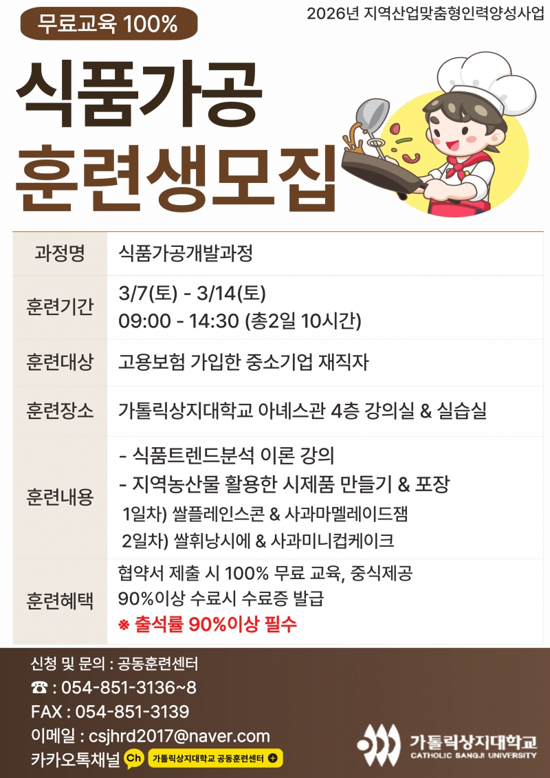 | 장소 | 가톨릭상지대학교 아녜스관 4층 이론강의실 & 서양조리실습실 |