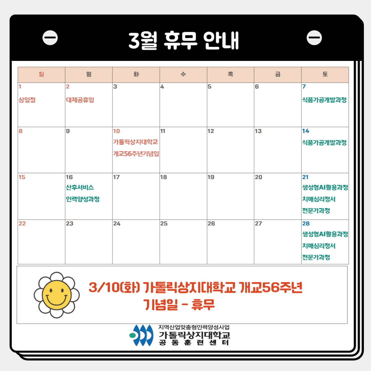 3월 10일(화) 가톨릭상지대학교 개교56주년 기념일 휴무